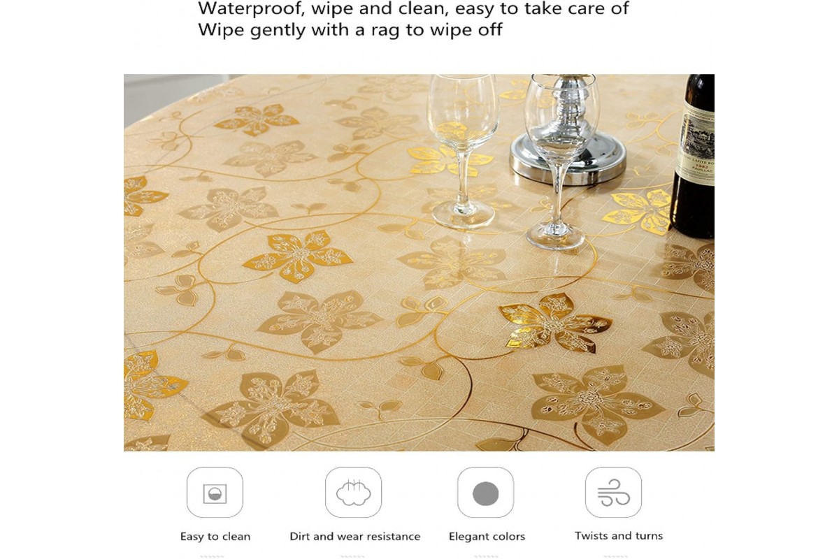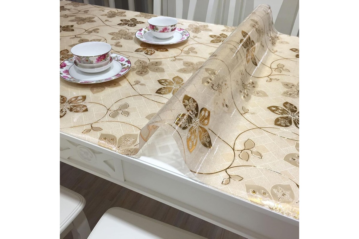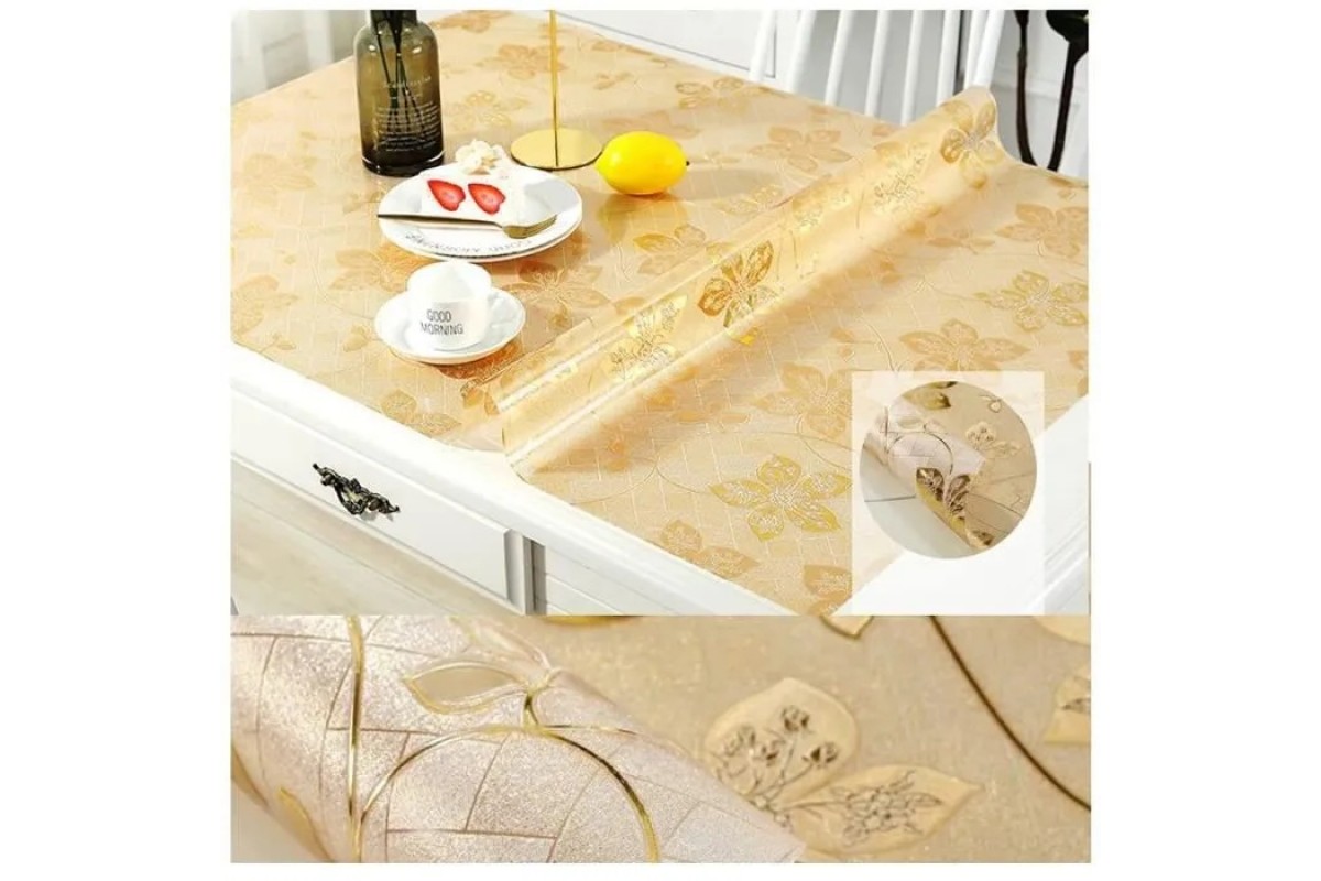Мягкое жидкое стекло с полупрозрачным золотистым фоном и утонченными красивыми цветами — это настоящее произведение искусства для вашего интерьера. Такая силиконовая клеенка станет отличным дополнением к праздничной или ежедневной сервировке стола, добавляя ему роскошного вида. Глянцевое мягкое стекло обеспечивает надежную защиту от влаги, царапин, пятен и высоких температур. Модель защитной накладки из ПВХ FLOWERS GOLD ляжет на любую поверхность — размер и форма клеенки режется по параметрам столешницы, поэтому и обеденные овальные столы, и небольшие квадратные столики могут быть украшены такой гибкой скатертью. Кроме того, прозрачная пленка из силикона достаточно практична в использовании, так как легко чистится, не теряет блеска со временем и не скользит по поверхности. Гибкая пленка прекрасно подходит для тех, кто ценит эстетику и практичность в деталях.