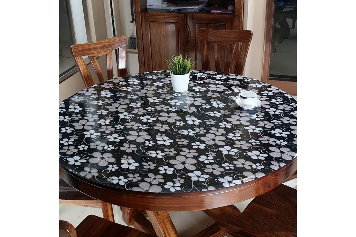 Прозрачная скатерть из качественного силикона — лучшее решение для защиты мебели от пятен, потертостей и механических повреждений. Такая гибкая накладка прекрасно вписывается в интерьер помещения, а выбор красивого дизайна позволяет не только сделать комнату уютнее, но и «освежить» обстановку, не прибегая к ремонту или замене мебели. Модель мягкого стекла FLOWERS BLACK отличается привлекательным видом — белые цветы на черном фоне будут прекрасно смотреться на любом обеденном или журнальном круглом столе. Размер гибкого покрытия для защиты мебели подрезается под ширину вашего круглого стола с учетом возможной усадки. Стоит отметить, что жидкое силиконовое стекло — это настоящий помощник в домашнем хозяйстве, так как в разы упрощает уборку: легко моется, не впитывает запахов, не трескается и не меняет цвет. При производстве защитной клеенки используется качественный, но тонкий ПВХ (1,7 мм), поэтому долговечность изделия гарантирована.
